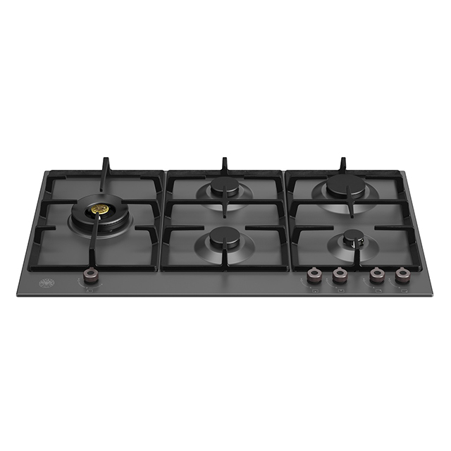 This Bertazzoni Professional 90cm gas hob is finished in carbonio enamel. With five brass burners and accurate metal control knobs, it makes cooking simple, versatile and precise. A lateral 5kW wok ring adds another dimension to your cooking. The cast iron pan support is solid and secure for safe use.